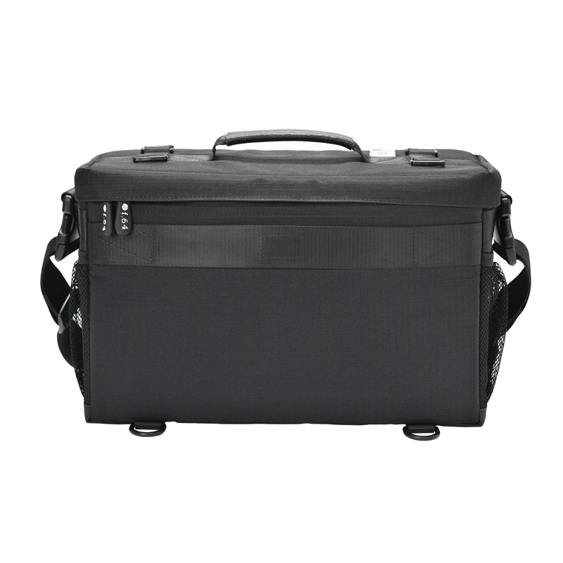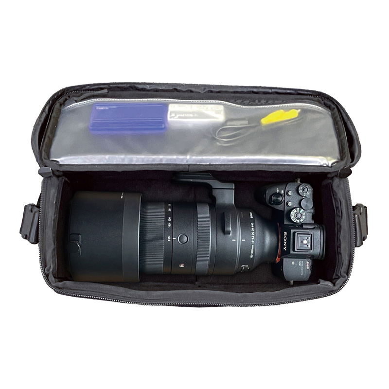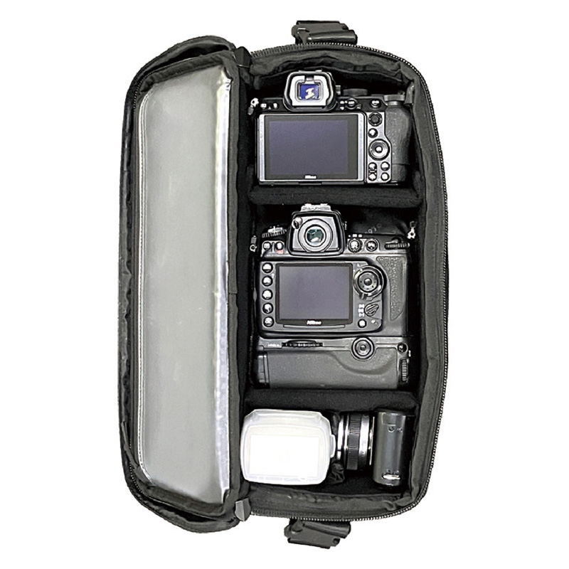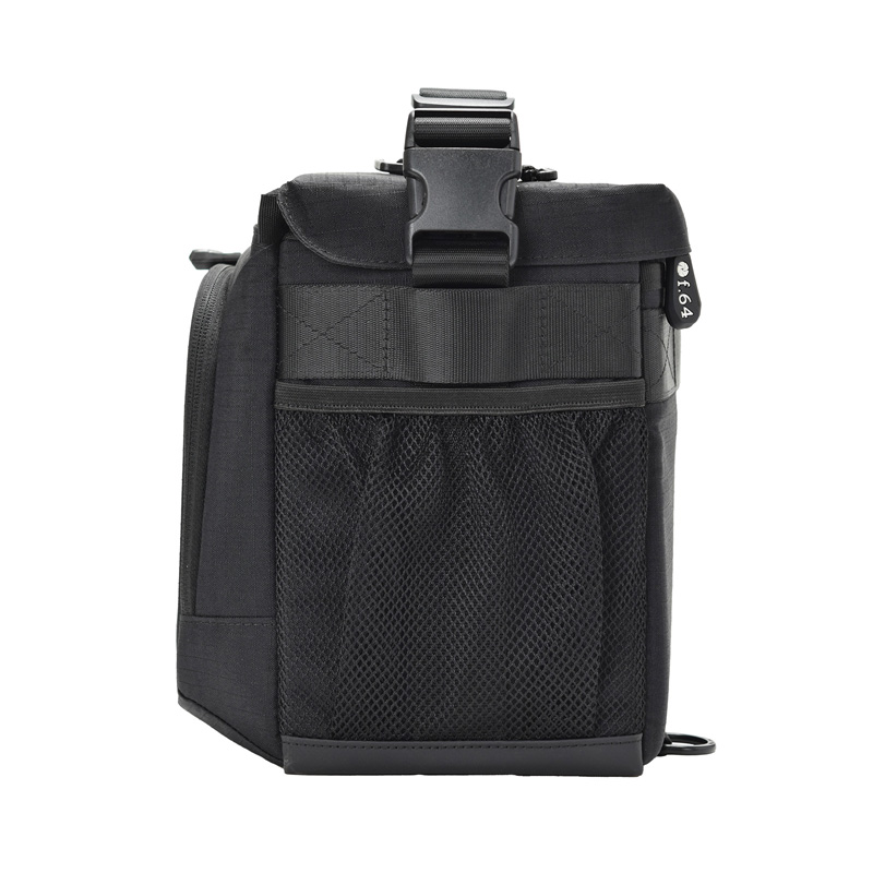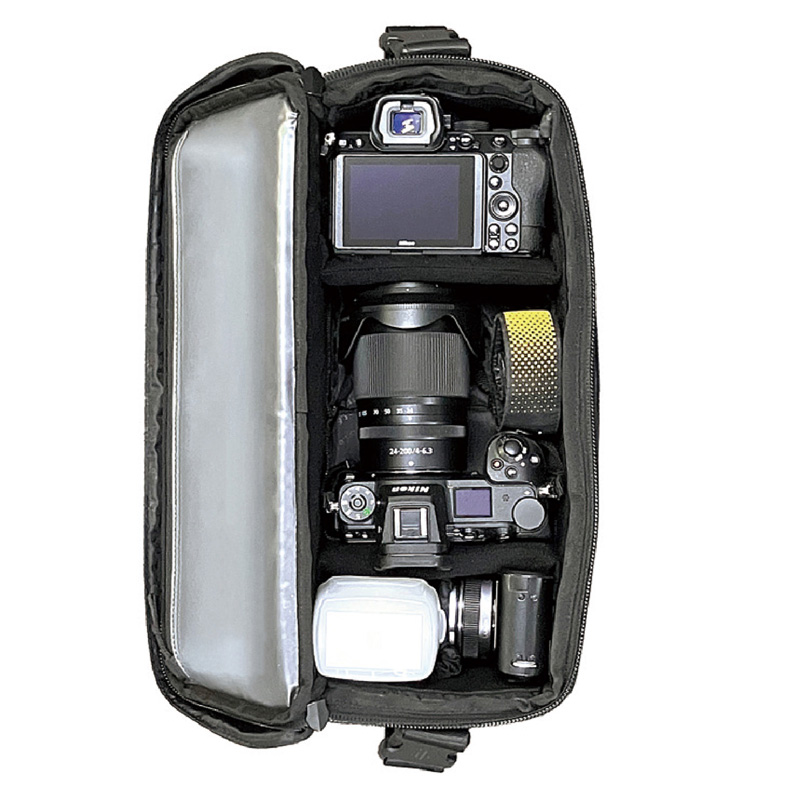 カメラバッグ特有の昔ながらのスクエア型のメイン収納は、一眼レフやミラーレス、交換レンズを効率的に収納できます。様々なサイズのフリーパーテーション中仕切り(8枚)でお持ちの機材にあわせて自由にレイアウト。メインフラップはf64で多く使われる外開き式。担いだままの状態でフルオープンにしても両手で機材の出し入れができます。フラップ裏面のクリアポケットは中身が見えて、中に入れたフィルターやメディアケースなど細かいアクセサリーが外から確認できます。