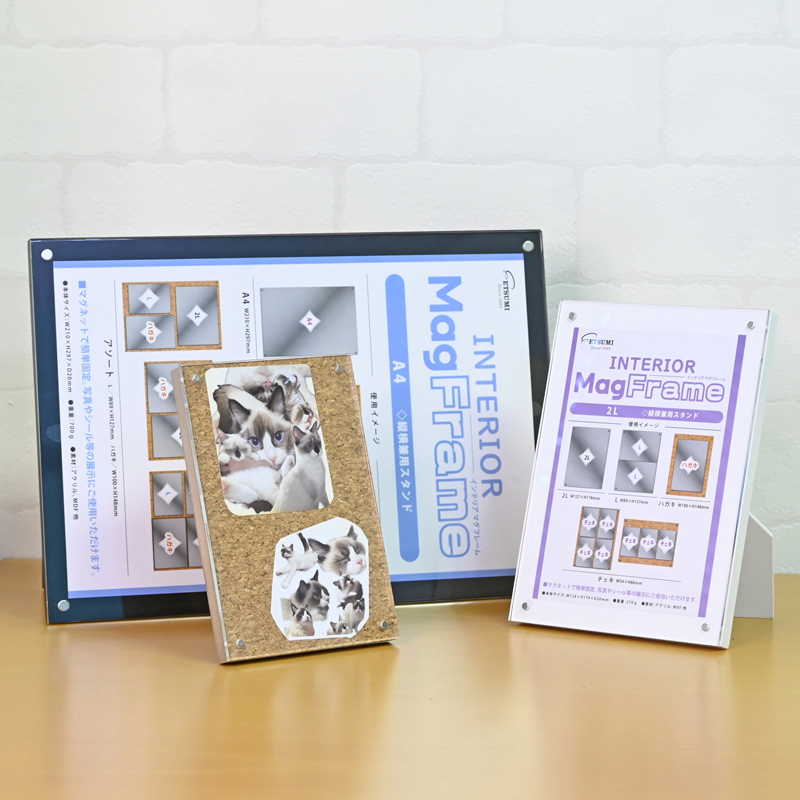 HOME 製品情報 額縁・整理用品 額縁・写真台紙 マグネットフォトフレーム A4/B5 マグネットフォトフレーム A4/B5 NEW ネットショップで購入 マグネットで簡単固定。1枚の写真はもちろん、スクラップブックの要領でも飾れます。縦横兼用のフォトフレームです。 オプション 製品 コード JANコード 希望小売価格 (税込) ブラック E-5606 4975981560699 3,630円 ホワイト E-5607 4975981560798 3,630円 コルクブラウン E-5608 4975981560897 3,630円 仕様 ブランド エツミ(ETSUMI) 本体サイズ 210×297mm(最大A4サイズ) 製品重量(約) 700g 材質 アクリル、MDF、他 用途 縦置き横置き兼用 原産国 中国