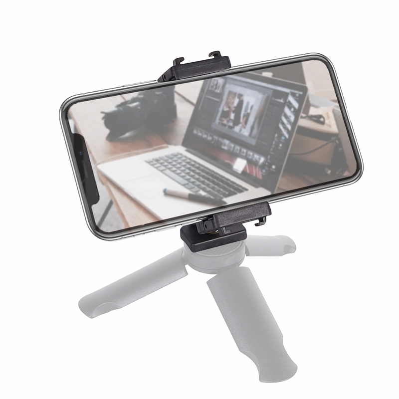 今までにないスマートフォンホルダー。クリップのようにつまんで広げて、スマホを装着するので指の挟まりなどの心配が不要。上下のコールドシューでマイクやライトも同時に装着可能。底部のネジ穴で三脚やスタンドへの取り付けも可能です。ホルダー単体でスタンドにもなります。